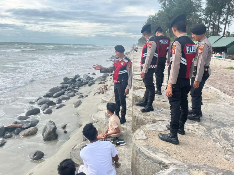 Personel menyampaikan imbauan kamtibmas kepada para pengunjung, agar tidak mandi atau berenang di pantai demi keselamatan.